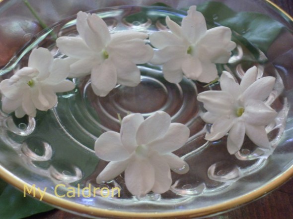 For Montreal’s weather (zone 5) this is certainly considered a houseplant, but it could benefit the fresh air, nice warmth and thereby fully flourish for a couple of months from June to August, depending on the weather. I take mine out in a half-sun spot once we have at least 25 Centigrade outside. Soon, it comes to life with glowing green leaves and delightful white buds. I just love the scent of its full grown delicate flowers, and sometimes collect the ones which have fallen off, put them in a saucepan full of water and keep them a bit longer on my dining table. Before bringing the plant in again, I wash it thoroughly and make sure it is pets free, and I also prune in back to a manageable size, as it does grow a lot while enjoying the warm weather.
