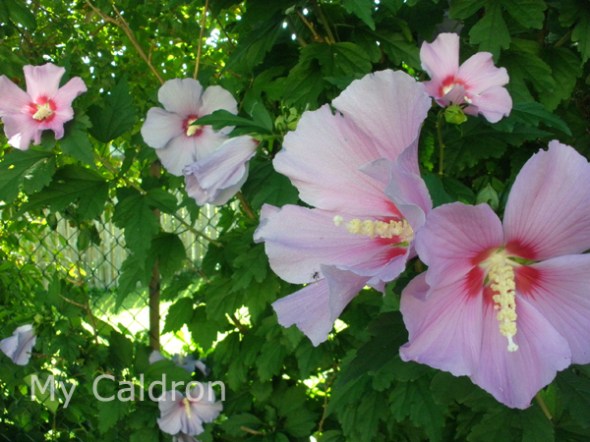 Dahlia and Rose of Sharon, perennials that bloom by mid July and last till early September. Dahlia needs more sun than Rose of Sharon, but both tolerate most soil types and need little water (in Montreal weather). Dahlia’s bulbs need storing before the end of October.